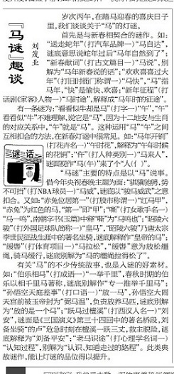 “马谜”主要的特点是以“马”说事。借今年央视春晚主题为面:“骐骥驰骋,势不可挡”(打NBA球员一)“马威”,谜底以“骏马威武”之意扣合。又如:“赤兔位居第一”(打股市称谓一)“红马甲”,“赤兔”为红色的马,“第一”即“甲”;“嘶”(打女歌手名一)“马一鸣”,南朝字书《玉篇》中释“嘶”为“马鸣也”;“昭陵六骏”(打外国足球队简称一)“皇马”,“昭陵六骏”乃唐太宗李世民征战生涯中的著名坐骑,谜底解释作“皇帝的马”;“缓辔”(打体育项目一)“马拉松”,“缓辔”意为放松缰绳,骑马缓行,谜底别解为“马的缰绳拉得松了”。