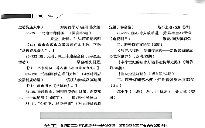 本次“雁云灯谜艺术奖”共有一、“雁云灯谜作品奖▪佳谜(30则)”二、“雁云灯谜文论奖(3篇)”和三、“雁云灯谜艺术奖▪灯谜普及突出贡献奖(3人)”,第三项获奖者是江更生(上海)、丛川(杭州)、聂大林(美国)。